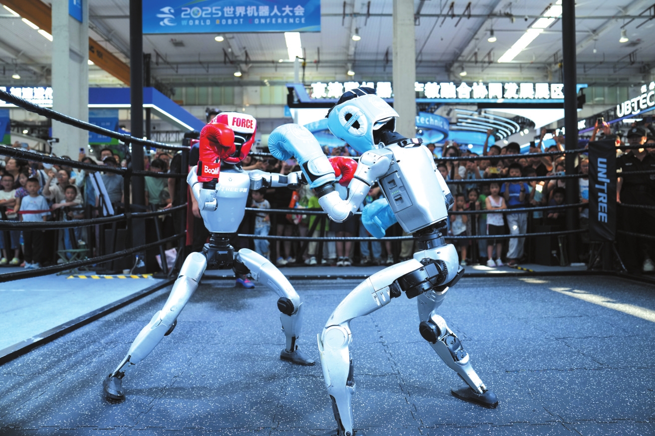 在世界机器人大会展馆内,观众在宇树机器人展台观看机器人拳击展示(8月11日摄)。2025世界机器人大会8月8日至12日在北京亦庄举行,大会设置的创新馆、应用馆、技术馆,汇聚了国内外200余家机器人企业的1500余件展品,其中有50家人形机器人整机企业带来最新展品及行业解决方案。在展馆现场,观众可看到从医疗服务到工业生产再到生活服务,涉及生活方方面面的各类机器人产品,感受机器人“点亮”你我未来生活的无限可能。 新华社记者 鞠焕宗 摄
