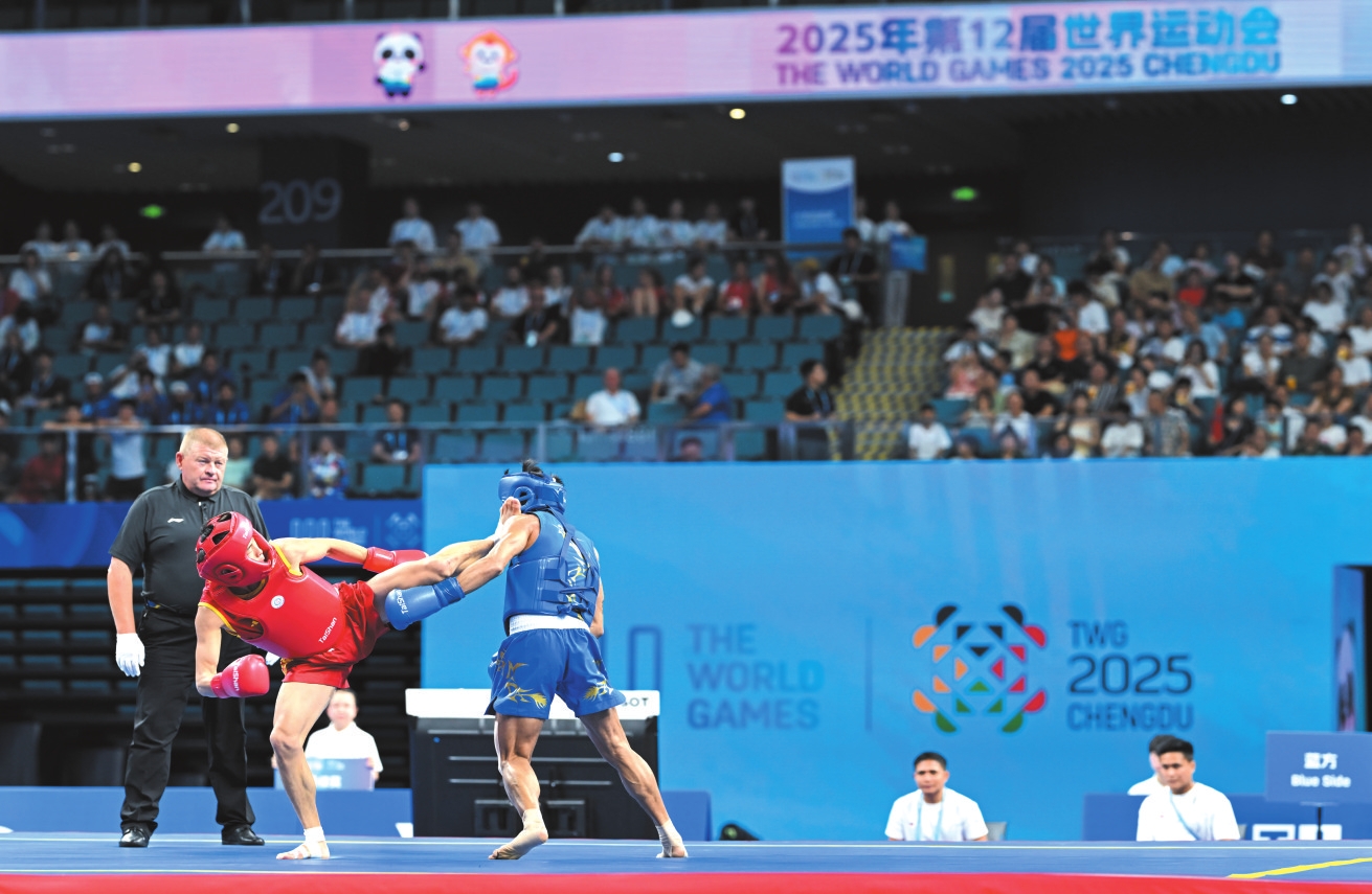 8月11日,中国选手唐思硕(前左)与菲律宾选手卡洛斯(前右)在比赛中。 当日,在2025年成都世运会武术男子散打56公斤级半决赛中,中国选手唐思硕战胜菲律宾选手卡洛斯,晋级决赛。 新华社记者 贝赫 摄