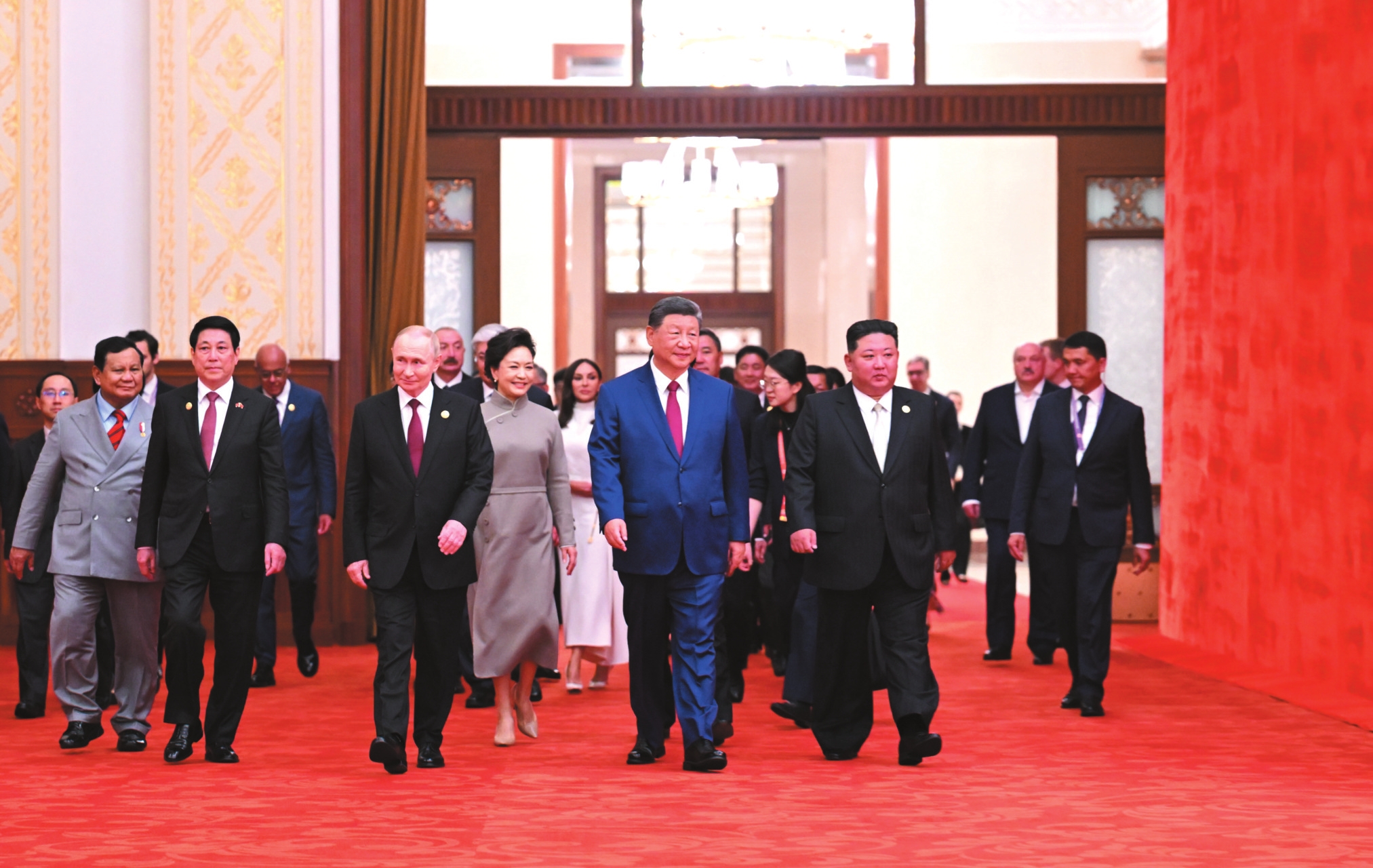 9月3日,纪念中国人民抗日战争暨世界反法西斯战争胜利80周年招待会在北京人民大会堂隆重举行。中共中央总书记、国家主席、中央军委主席习近平出席招待会并发表重要讲话。这是习近平和夫人彭丽媛同出席招待会的外国领导人夫妇共同步入宴会厅。新华社记者谢环驰摄