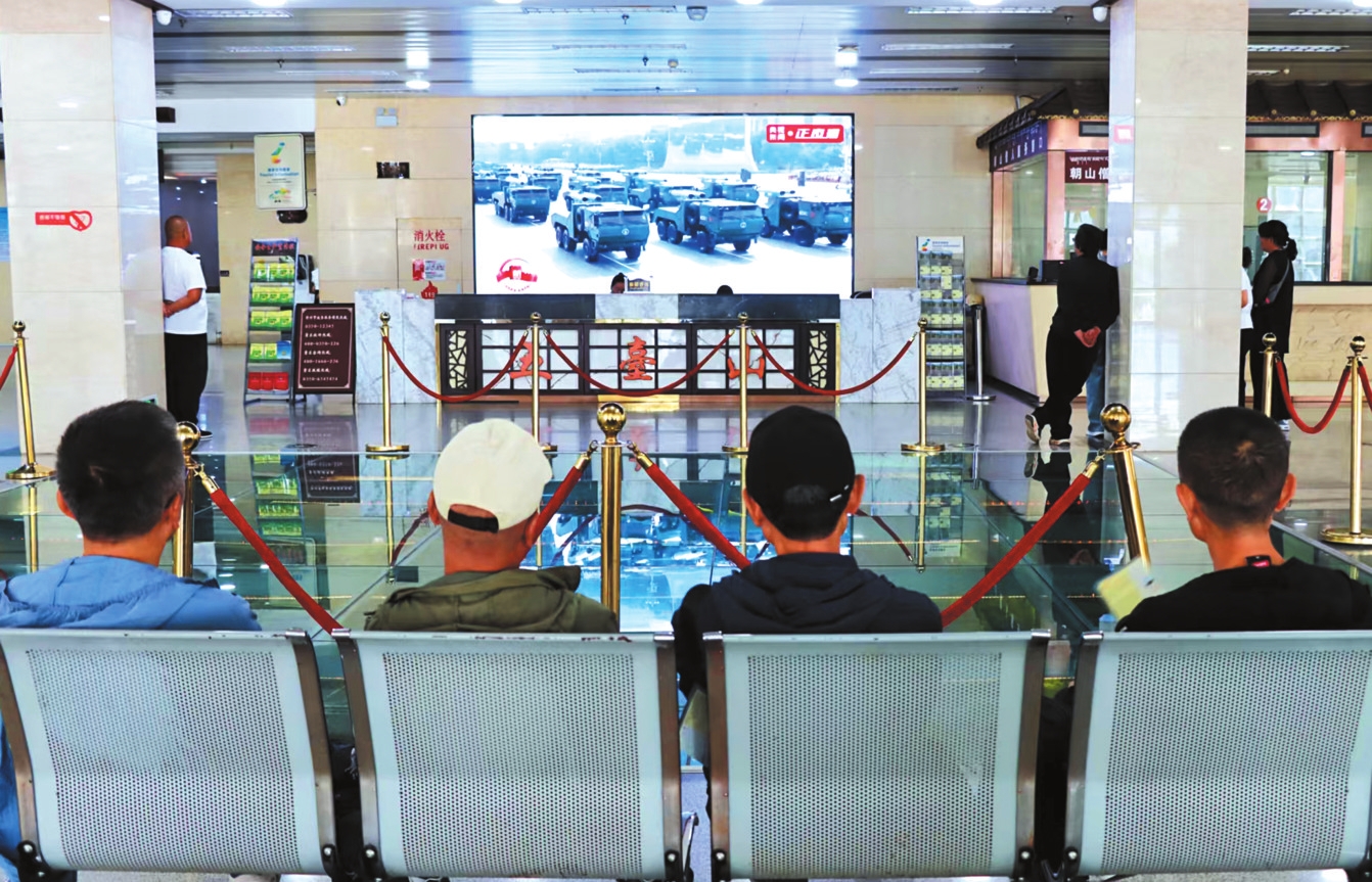 五台山景区游客服务中心大厅,游客正在观看纪念大会。张睿容摄