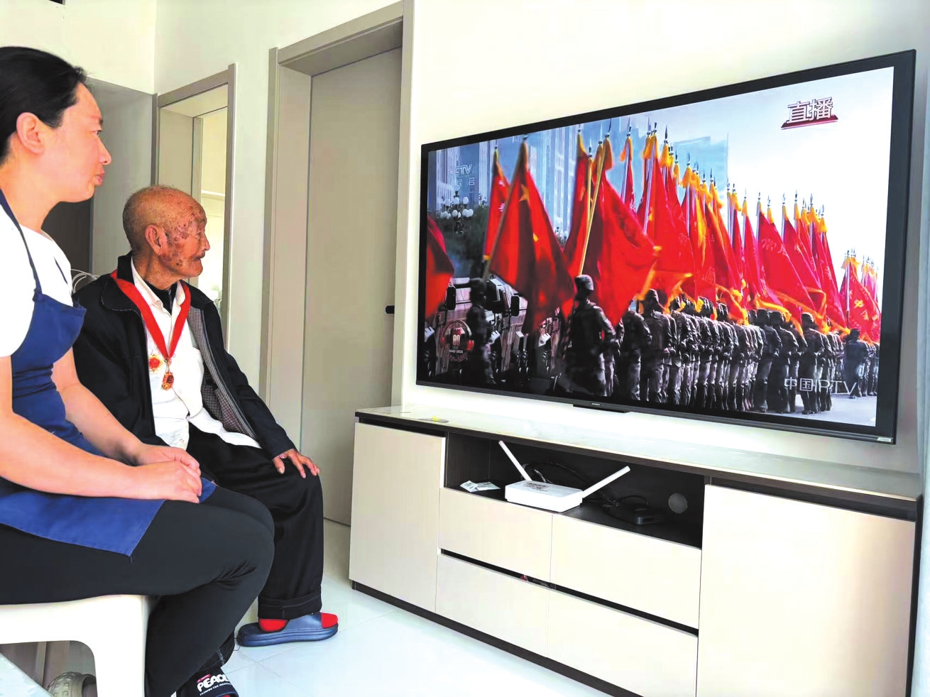 宁武县迭台寺乡忻州峪村95岁老党员赵福明在家中观看纪念大会。吴光宇摄