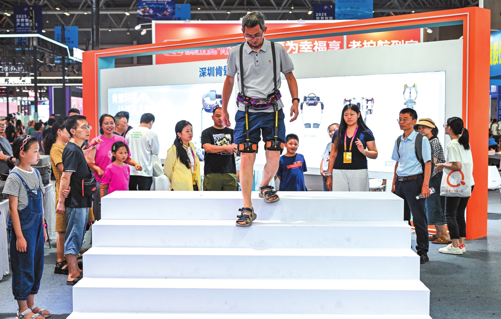 9月7日,观众在2025世界智能产业博览会上体验外骨骼机器人产品。