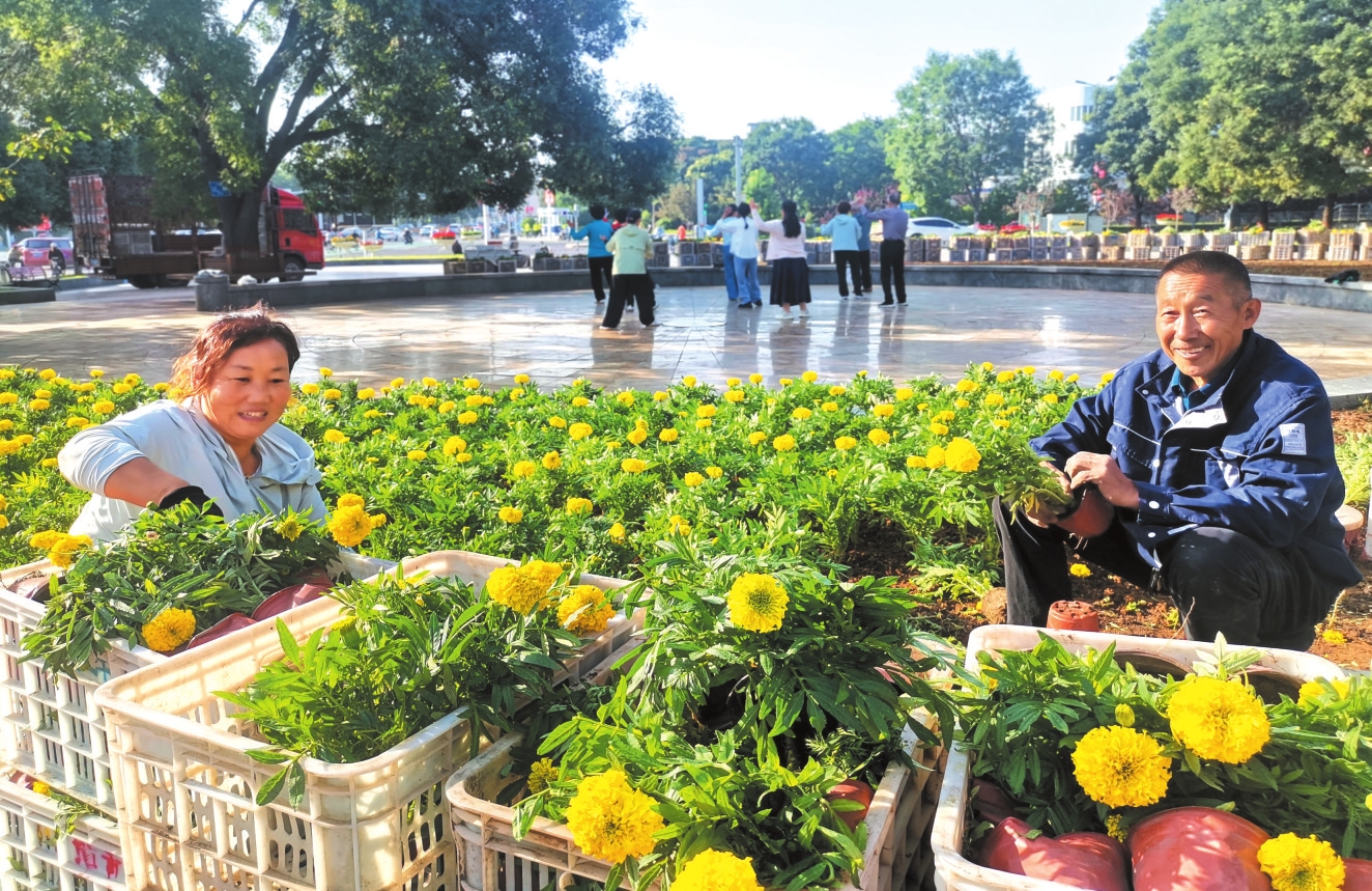 9月9日,山西云中园林工程有限公司人员在忻州城区日月广场更换万寿菊,让“日月同辉”主题花坛为城区添彩,喜迎国庆。 本报记者 宫清华摄