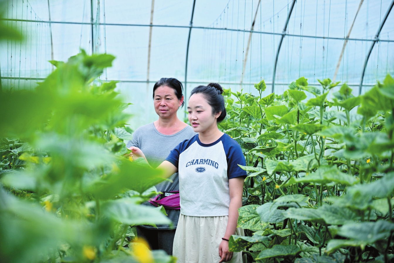 保德县暖泉村驻村大学生正在观察黄瓜长势。本报记者 冯晓磊摄