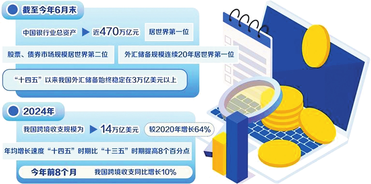金融业开放是我国整体改革开放事业的重要组成部分。截至今年6月末,中国银行业总资产近470万亿元,居世界第一位;股票、债券市场规模居世界第二位;外汇储备规模连续20年居世界第一位。我国在绿色金融、普惠金融、数字金融等方面走在世界前列,基本建成多渠道、广覆盖、安全高效的人民币跨境支付清算网络,移动支付处于国际领先水平。