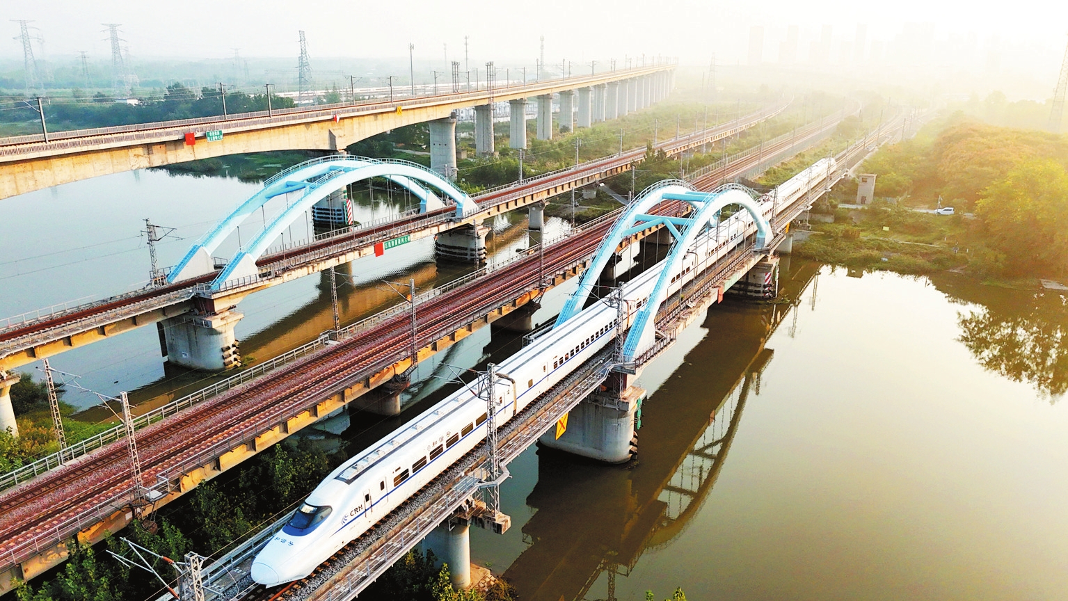 10月11日起,全国铁路实行新的列车运行图,铁路客货运输能力、服务品质和运行效率将进一步提升。图为10月10日,动车组列车行驶在江苏省连云港市海州区境内。