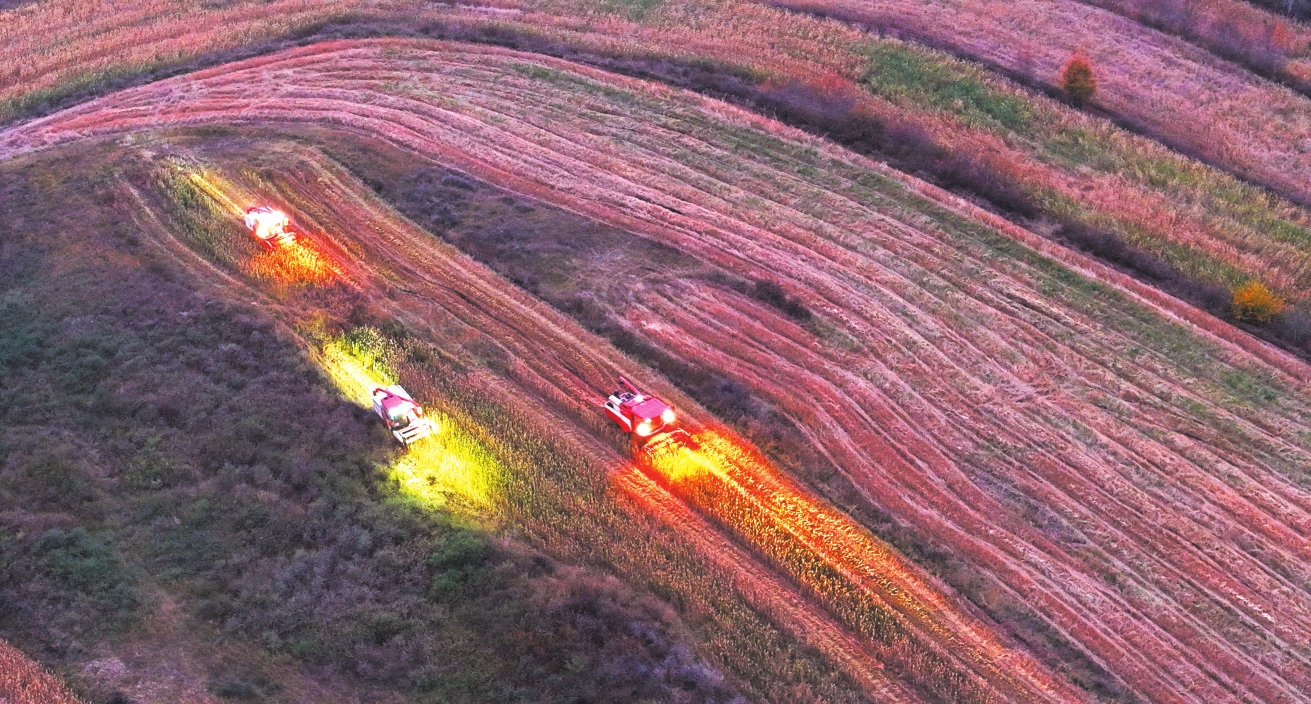 河曲县刘家塔镇千亩谷子基地搭载北斗导航系统收割机正在作业。何帅摄