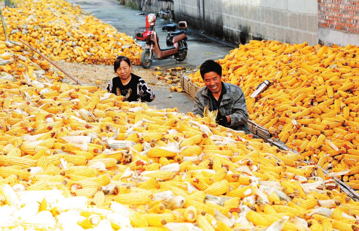 近日,原平市新原街道桃园村村民紧抓晴好天气晾晒玉米,农家场院呈现出一派喜人的丰收景象。褚震摄