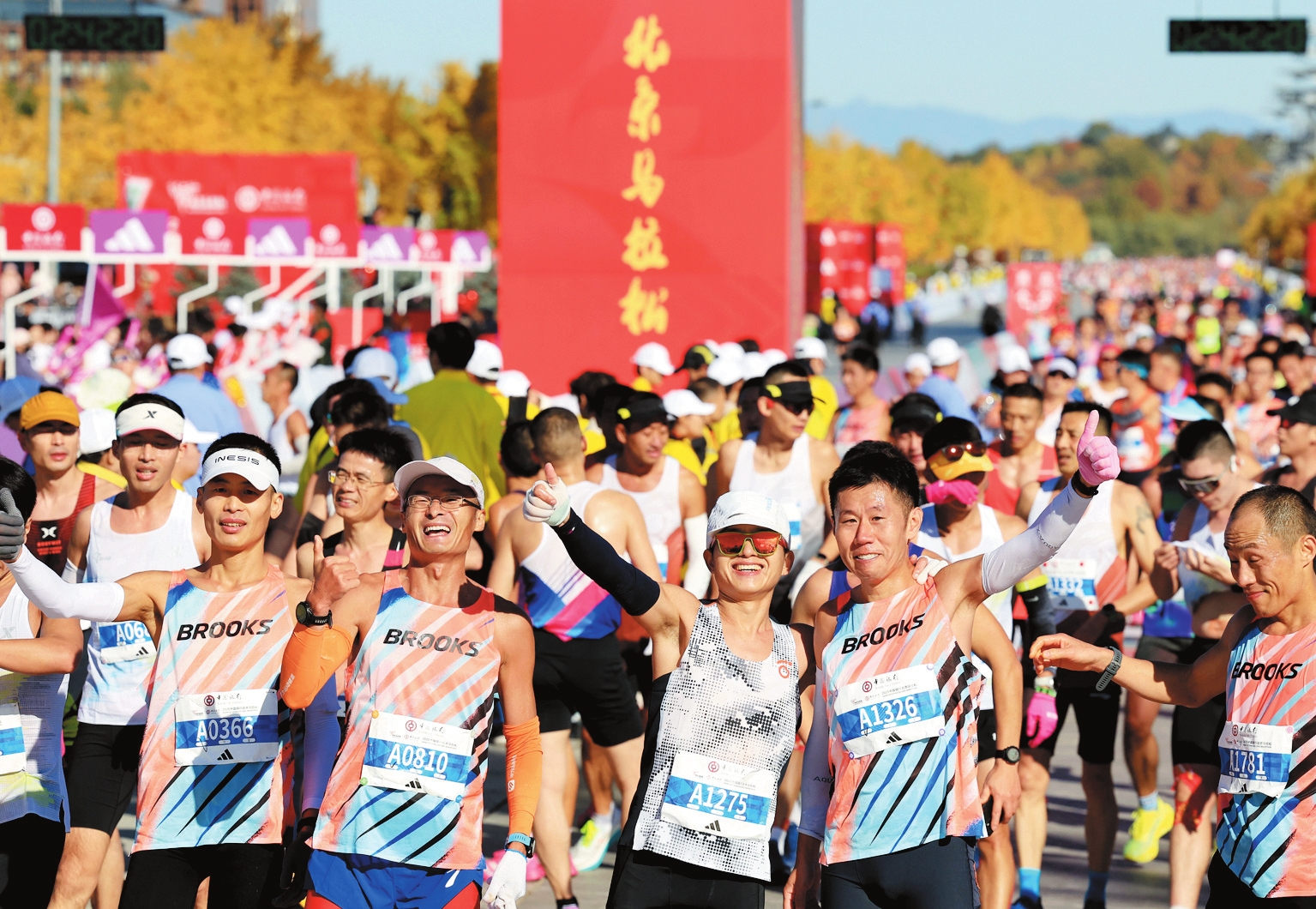 11月2日,2025北京马拉松在京举行。图为参赛选手在比赛终点庆祝完赛。 新华社记者 张晨霖摄