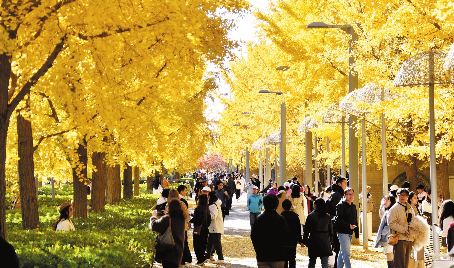 深秋时节,北京市街头和公园内的银杏等树木挂满黄叶,浓浓的秋色吸引大批市民踏秋赏景。图为11月2日,游客在奥林匹克公园观赏银杏。 新华社记者 李欣摄