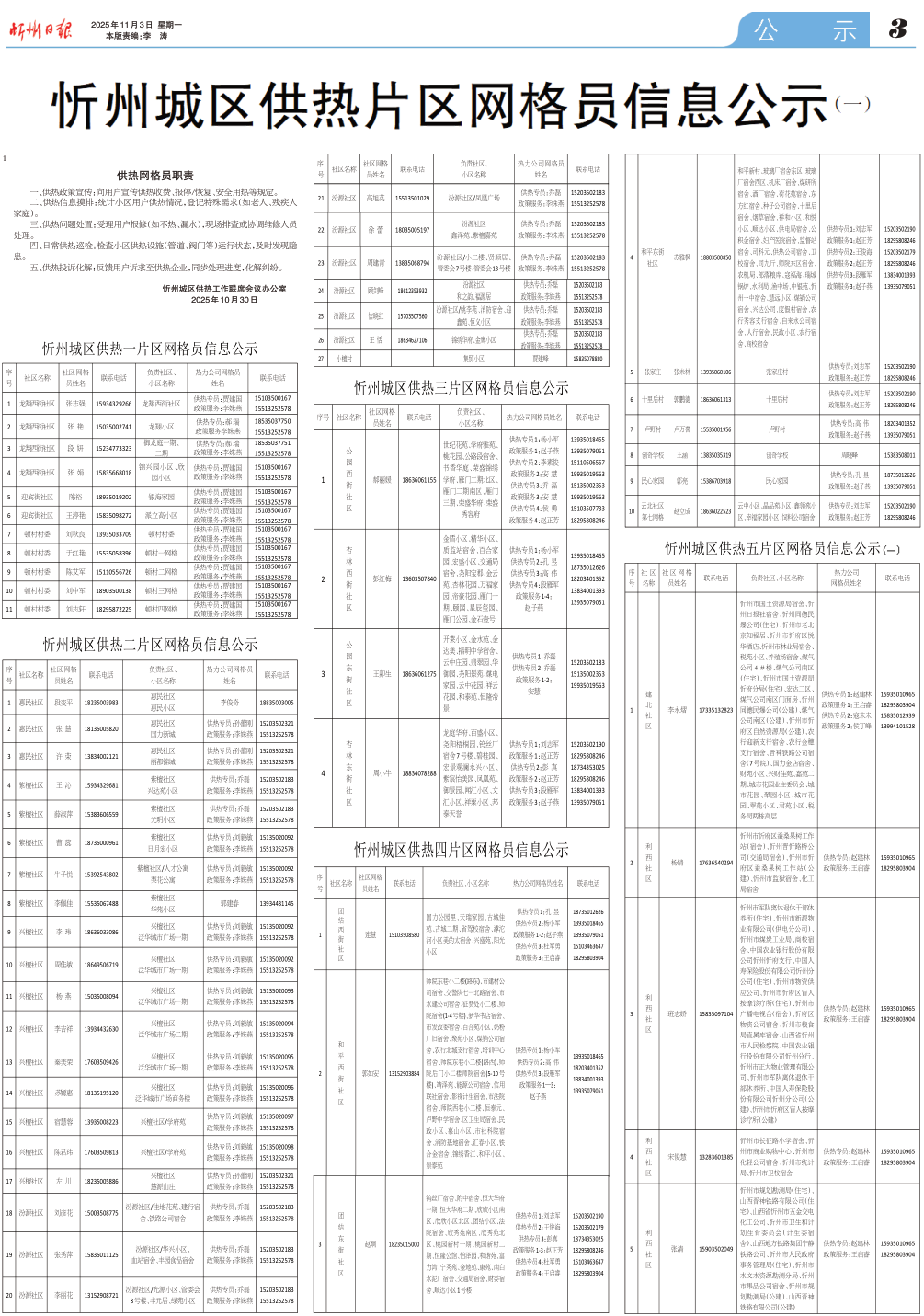 忻州城区供热片区网格员信息公示(一)