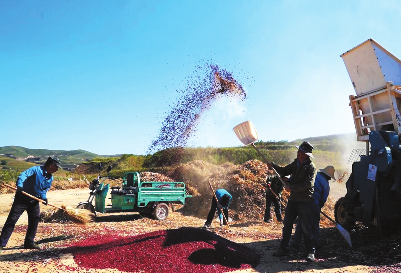 岢岚县西豹峪乡西豹峪村的村民在晒场上扬晒红芸豆。李倩摄