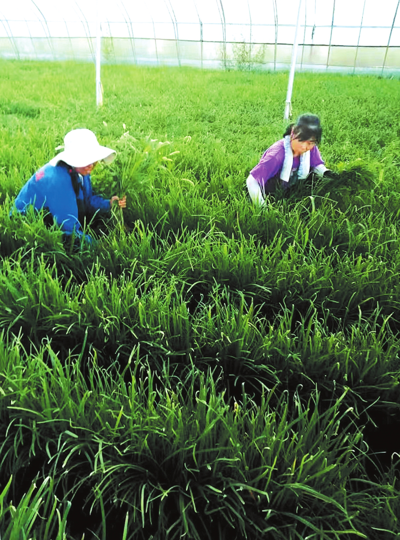 代县上馆镇橙草沟村的村民在日光温室韭菜大棚内劳作。石俊文摄