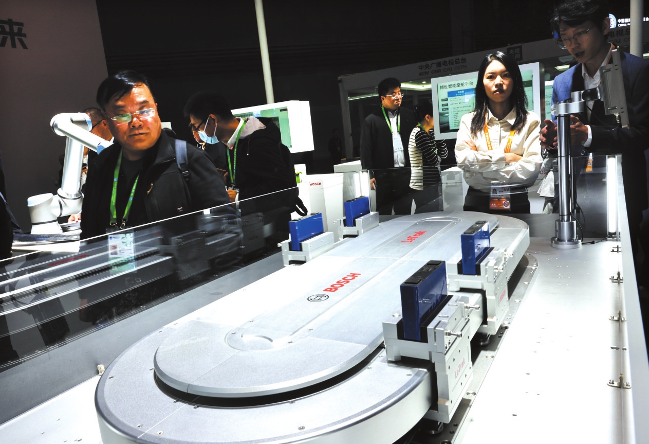 11月6日,参观者在博世公司展台展出的LeTrak磁驱传输系统展品旁驻足观看,这是该产品的全球首发。