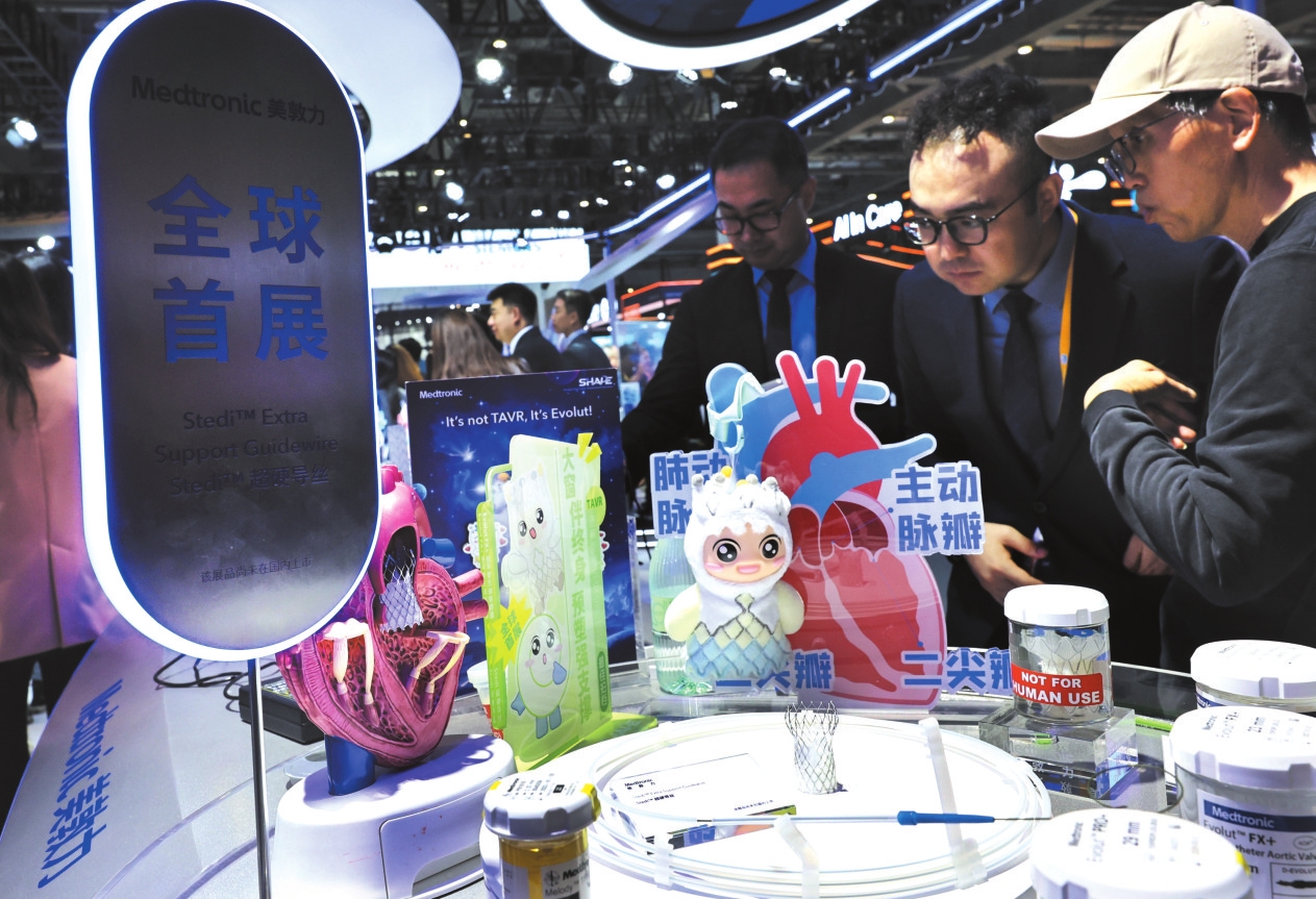 11月6日,参观者在美敦力公司一款超硬导丝产品展台前驻足观看,这是该产品的全球首展。