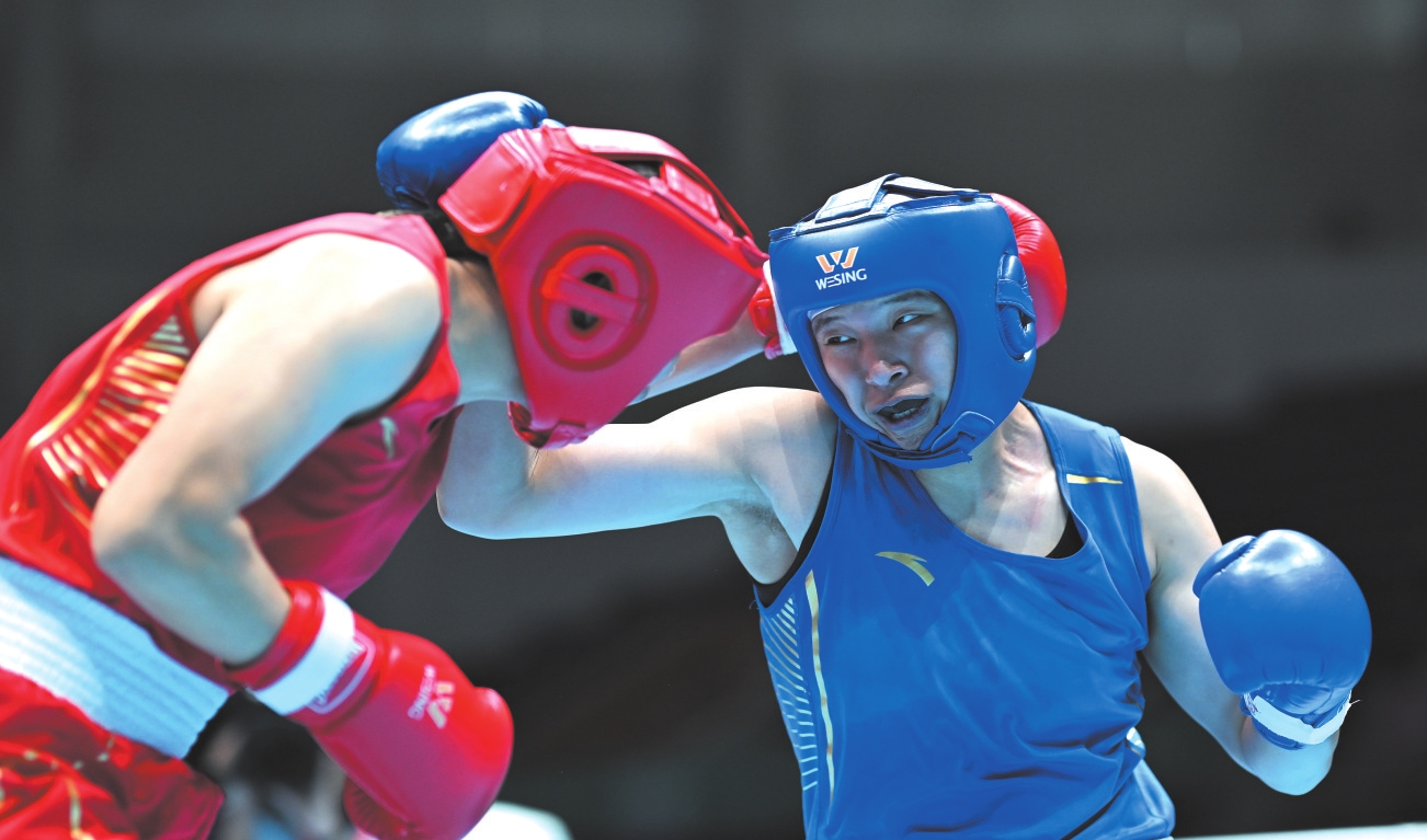 当日,在广东深圳进行的第十五届全国运动会拳击女子75公斤级决赛中,浙江队选手叶金战胜黑龙江队选手汪丽娜,夺得冠军。 新华社记者 杨冠宇 摄