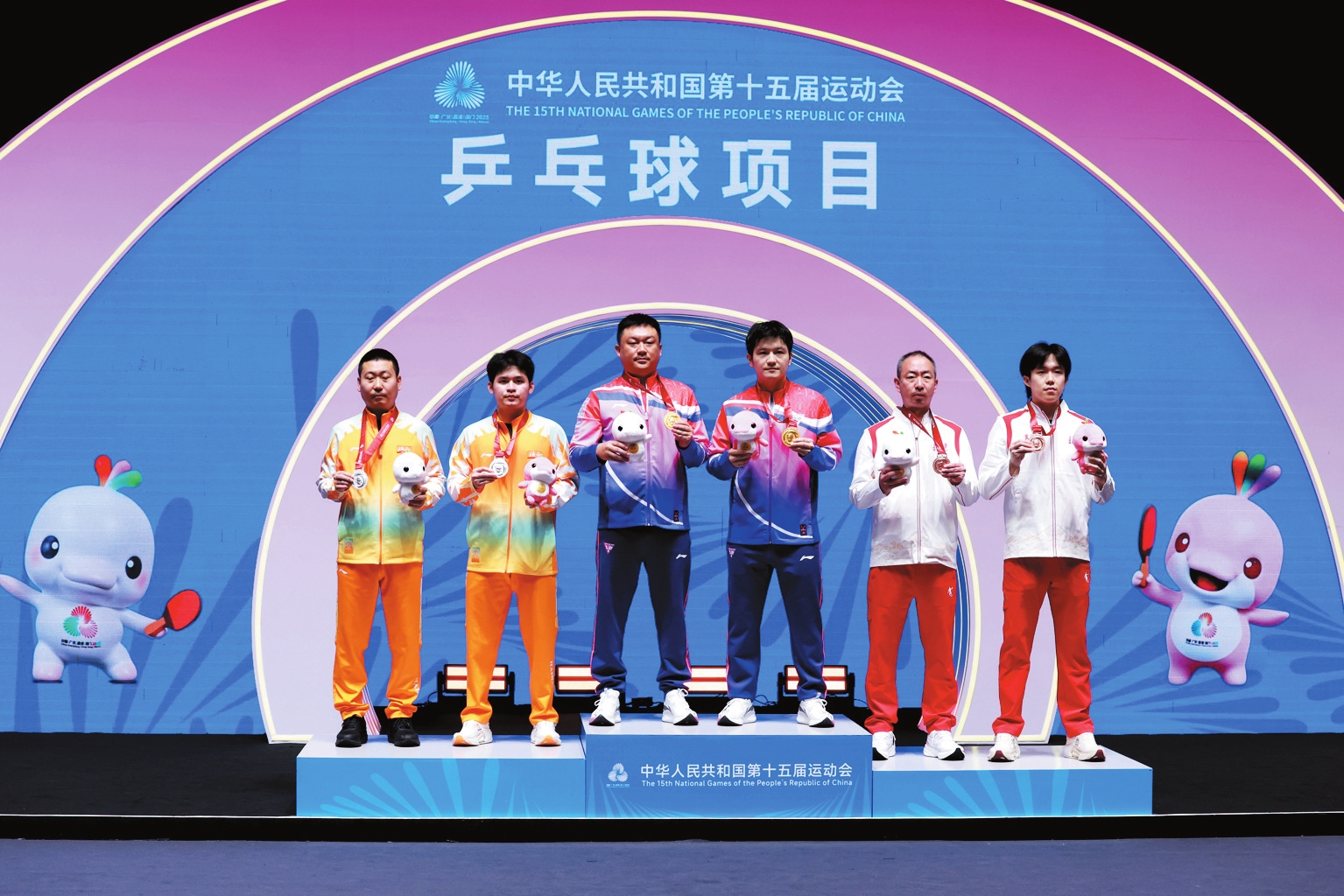 11月16日,在澳门举行的第十五届全国运动会乒乓球男子单打金牌赛中,上海队选手樊振东4比1战胜海南队选手林诗栋,夺得冠军。图为冠军上海队选手樊振东(右三)、亚军海南队选手林诗栋(左二)、季军北京队选手王楚钦(右一)和他们的教练员在颁奖仪式上。 新华社记者 梁旭摄