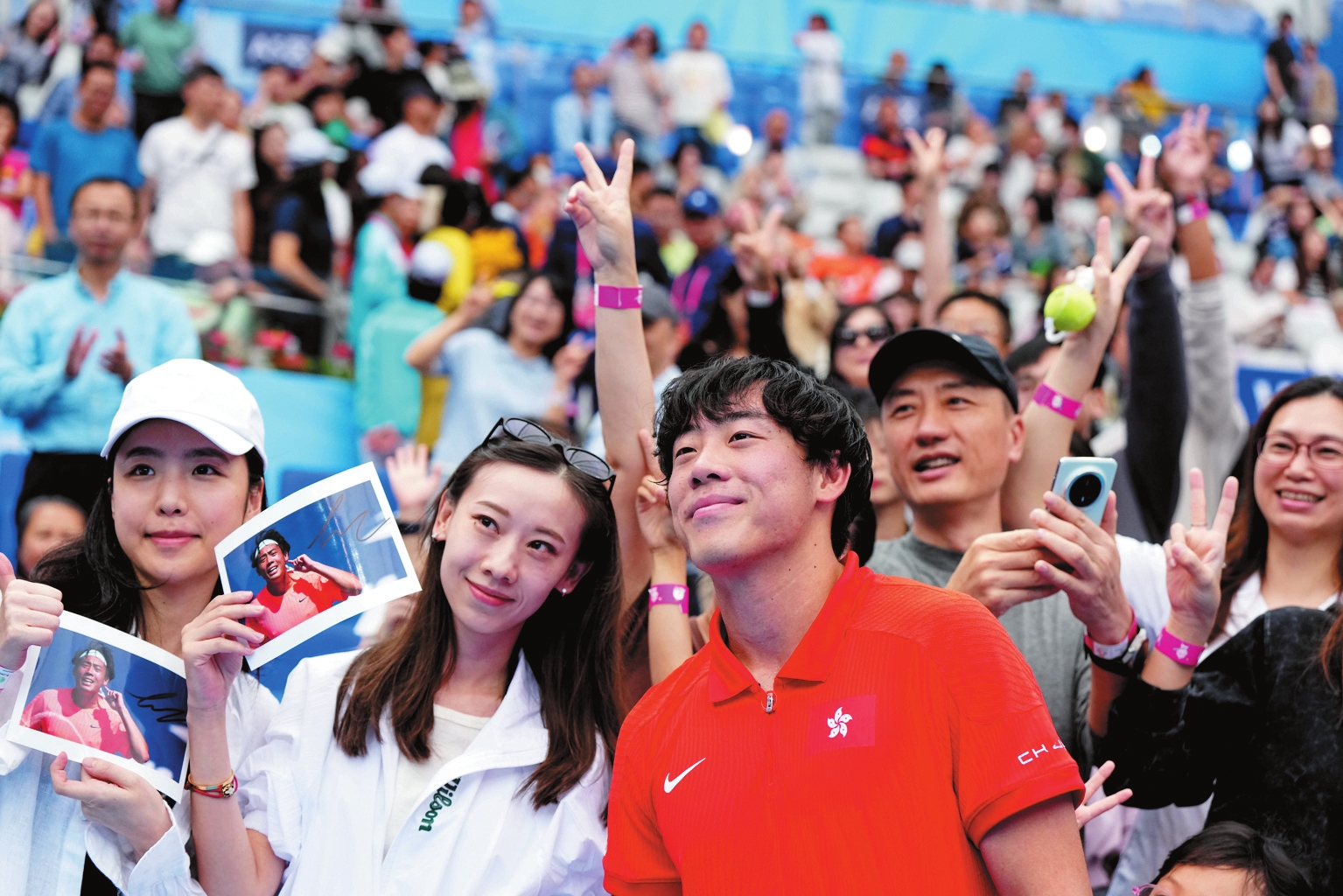 11月16日,第十五届全国运动会网球项目男子单打第二轮在广东横琴举行。图为香港队选手黄泽林在比赛结束后与观众合影。最终,他2比0战胜湖北队选手陈烨。 新华社记者 颜麟蕴摄