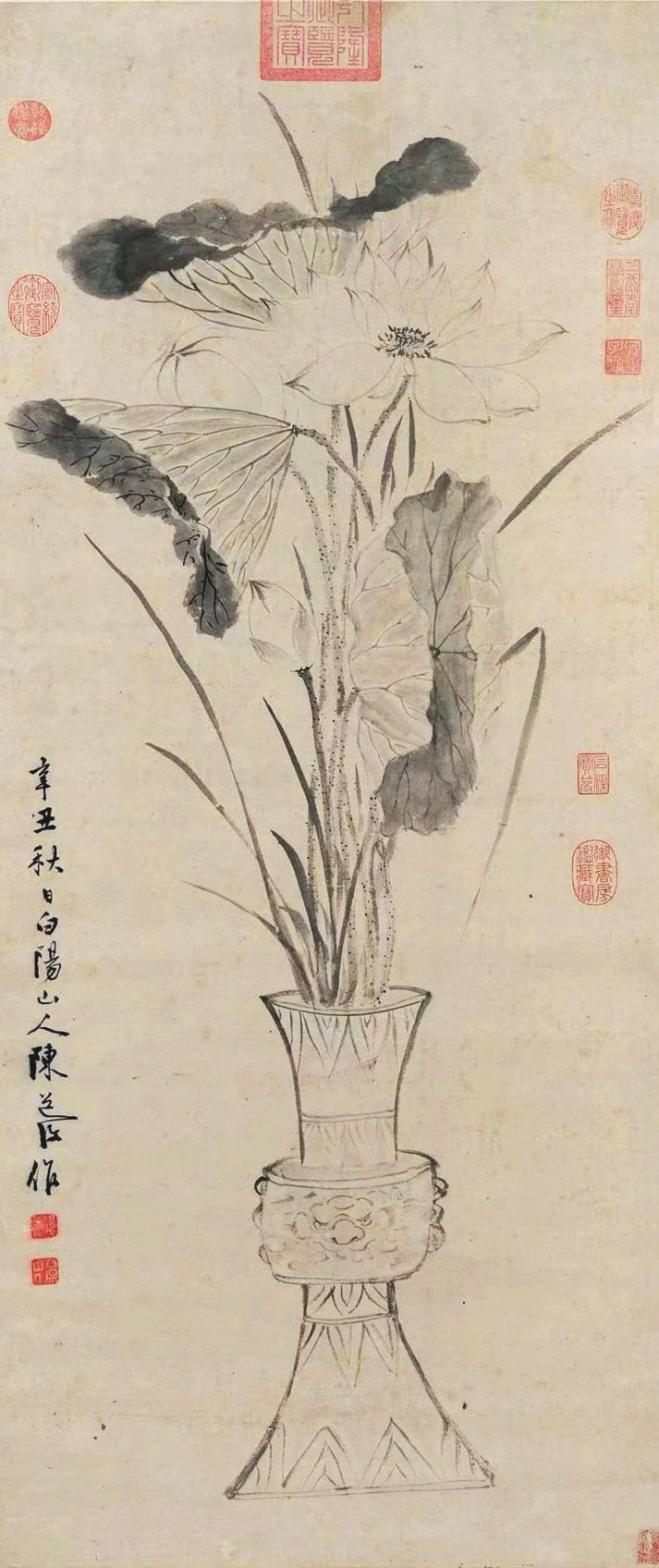 陈淳的《瓶荷写生图》中,一青铜花觚内插数枝荷花,细叶菖蒲点缀其间。向上伸展的枝叶几乎占满画面,尽显夏日花草的劲挺之气与蓬勃生机。此作给人最大的视觉感受是不拘一格的潇洒笔触与灵动造型,尤其靠下方的两片荷叶,以及右侧弯折垂下的一片细叶,甚至显现出一丝不加修饰的潦草、颓败之感,而恰是对此等细节的保留,生动体现出植物自然的生长姿态。