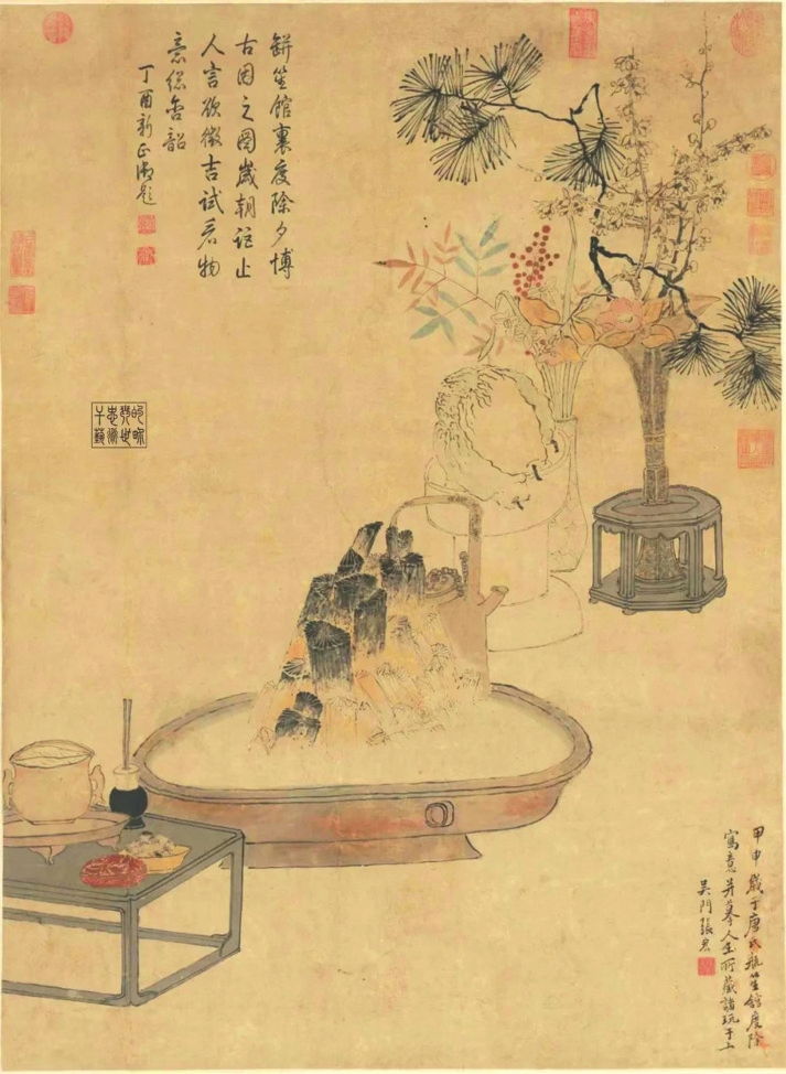 值得一提的是,明代文人对于古朴清雅的审美追求,不仅反映在花材与花器的选择上,还体现在赏花时的意境中。《瓶史》在论述插花品赏时云:“茗赏者上也,谈赏者次也,酒赏者下也。”明代文人插花推崇品茗清赏,追求高雅清净,借由插花来体悟生命真趣。陈洪绶的《校书图》中,两位文士分坐于石案两侧执卷阅读,案上的宽口白瓷花钵内插白梅一枝,与书籍、茶具、古铜器相映成趣。画面简约高古,毫无市井野气,只留雅致清韵。