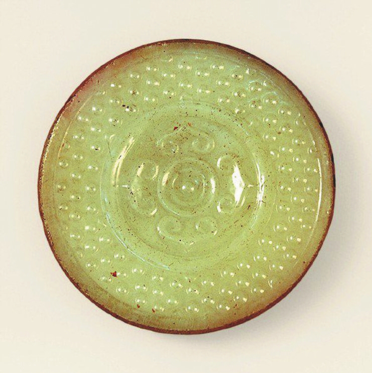 楚人好剑,有佩剑、赠剑、葬剑之风。以玉器作为剑的装具盛行于春秋战国至汉代,当时人们以玉具剑彰显身份地位。一柄完整的玉具剑由剑首、剑格、剑璏、剑珌4个玉饰物组成。湖南不产玉,古代常以玻璃仿玉,器形多为璧、环、剑饰等。古代玻璃器出土极少,这件柿蒂纹谷纹玻璃剑首对研究我国古代玻璃器的源流具有重要意义。