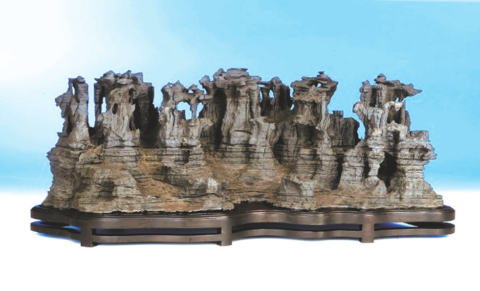 武陵源位于湖南西北部,由张家界森林公园、索溪峪和天子山自然保护区组成,总面积500多平方公里。亿万年前这里曾是海洋,经“燕山运动”鬼斧神工的雕琢,形成如今奇峰耸立的原生态景观。我请木工师傅采用明式样式与生漆工艺,用紫光檀为其定制底座。奇石安放后,一幅气势磅礴的奇峰画卷跃然眼前。