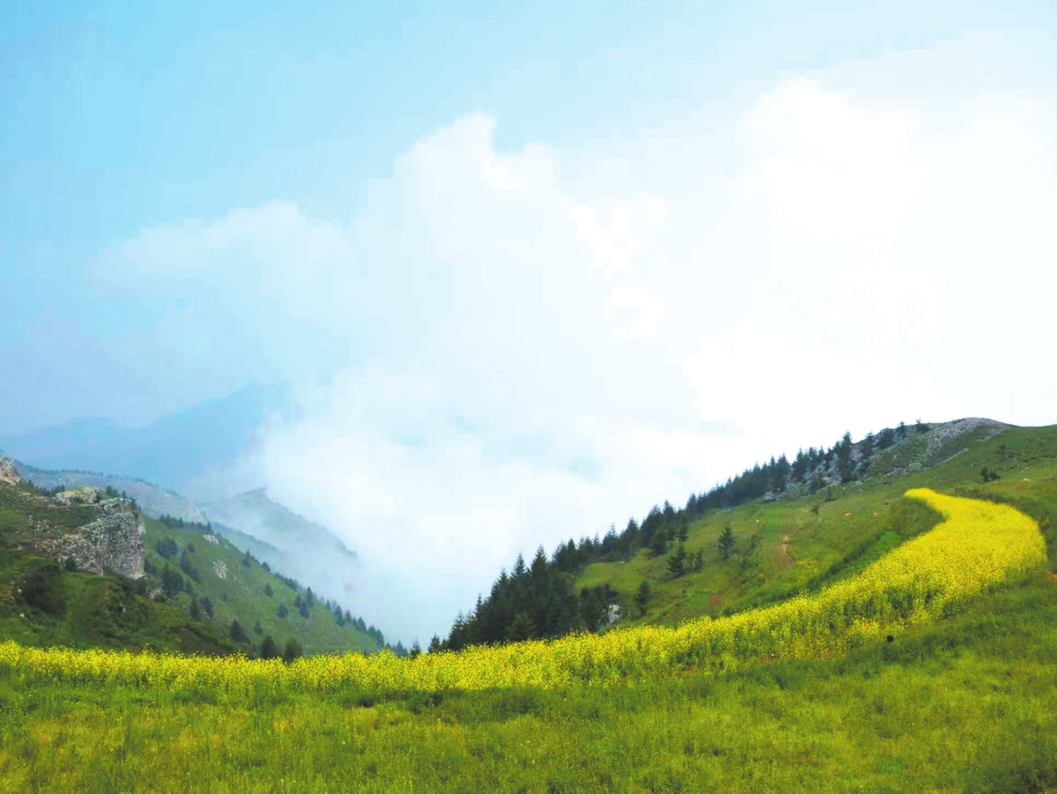环绕着小山村四周,有数块油菜花肆意开放,黄灿灿的色调在山顶上特别醒目,与峰峦上的青草绿树形成强烈对比,相映成景。