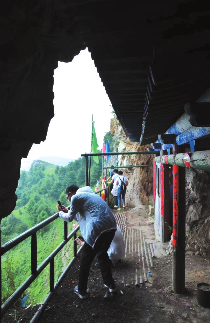 从老君洞主峰下的羊肠小道向前走,可望见峰峦半腰间露出建筑物一角,那便是老君庙了。登临老君庙,依靠在山的裂缝里开凿出的一条栈道,一脚一蹬,一步一攀,急不得,快不了,就这样亦步亦趋才能抵达这座悬在半空的小庙。