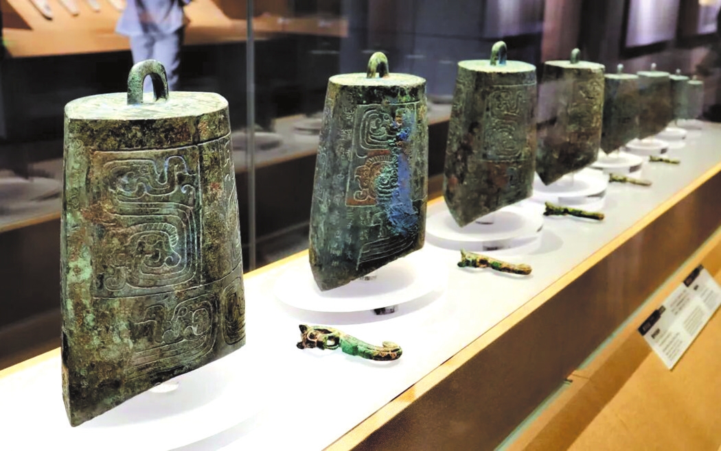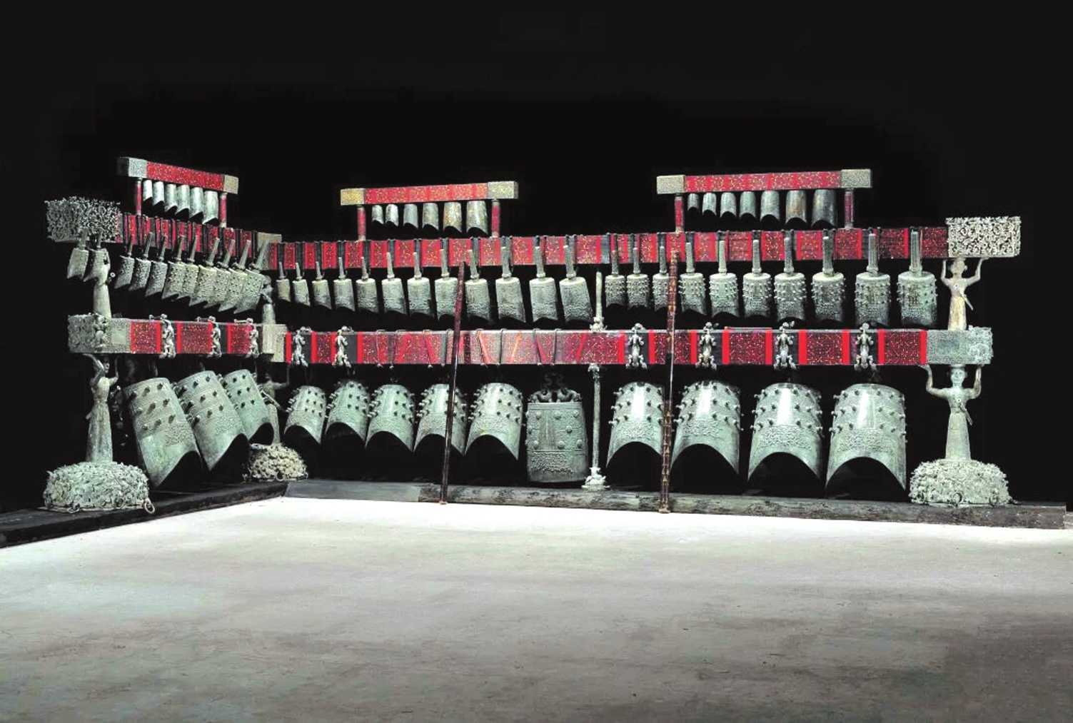 最具代表性的乐钟无疑是“青铜之冠”的曾侯乙编钟,它展现了先秦礼乐文明与青铜铸造技术的最高成就。曾侯乙编钟是战国早期曾国国君的“礼乐重器”,1978年出土于今湖北随州的曾侯乙墓,是迄今发现数量最多、保存最好、音律最全、气势最宏伟的一套编钟,共65件,分3层8组悬挂于彩漆钟架之上,钟体总重达2.5吨。整套编钟低音浑厚、中音圆润、高音清脆,音域宽广,而且中心音域内半音齐备,可以旋宫转调,演奏各种音乐。1978年8月1日,沉寂了2400多年的曾侯乙编钟演奏了《东方红》《国际歌》和古曲《楚殇》、民族歌曲《草原上升起不落的太阳》等各种乐曲,乐音悠扬回荡。