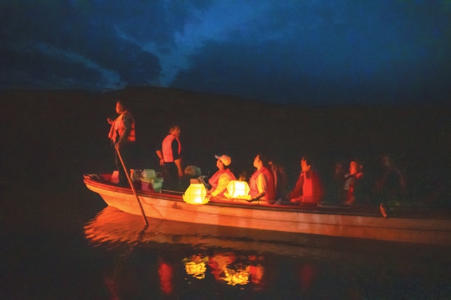 七月十五晚上,沿河三省居民纷至沓来。会首手持火把引路,百姓们把他们精心做好的各式河灯在船工的指导下漂放河中。灯海非常壮观,视者赏心悦目,祭者心灵得到安慰,同时戏台上的唢呐、鼓声、锣声也在响起,又一场戏剧在登场。