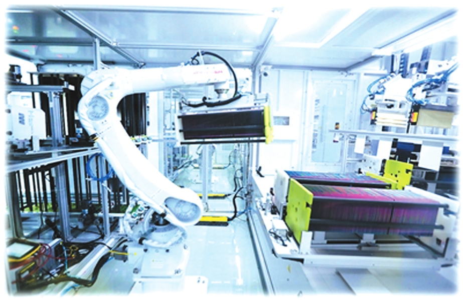 ▲在江苏仪征经济开发区一家企业的智能制造车间内,机械臂在搬运电池片。