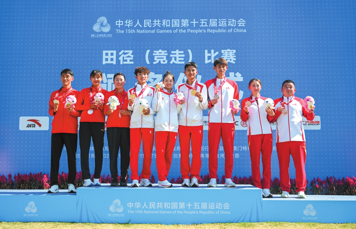 11月17日,获得冠军的北京队选手石升吉(左四)和杨家玉(中)、获得亚军的陕西队选手李炎东(左一)和杨柳静(左二)、获得季军的山东队选手李林(右三)、史宇霞(右二)与教练一起在颁奖仪式上合影。当日,第十五届全国运动会田径项目马拉松竞走混合接力颁奖仪式在珠海举行。 新华社记者 连振 摄