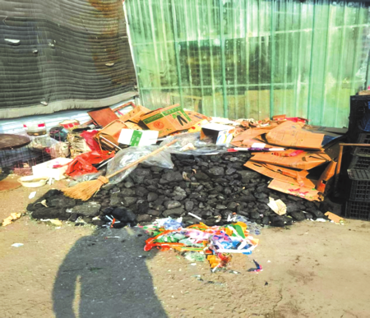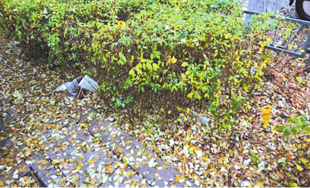 建设路万福家园小区西侧门面房前绿化带垃圾较多。