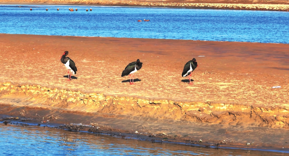 黑鹳对栖息地环境十分严苛,被誉为“鸟中大熊猫”。它们体态优美,身披黑褐色羽毛,在阳光下泛着金属光泽,红色的长嘴和双腿格外醒目。几只黑鹳在湿地公园浅水区和滩涂间悠然觅食,表明此处食物资源丰富,且人为干扰稀少,是它们理想的栖息停歇地。