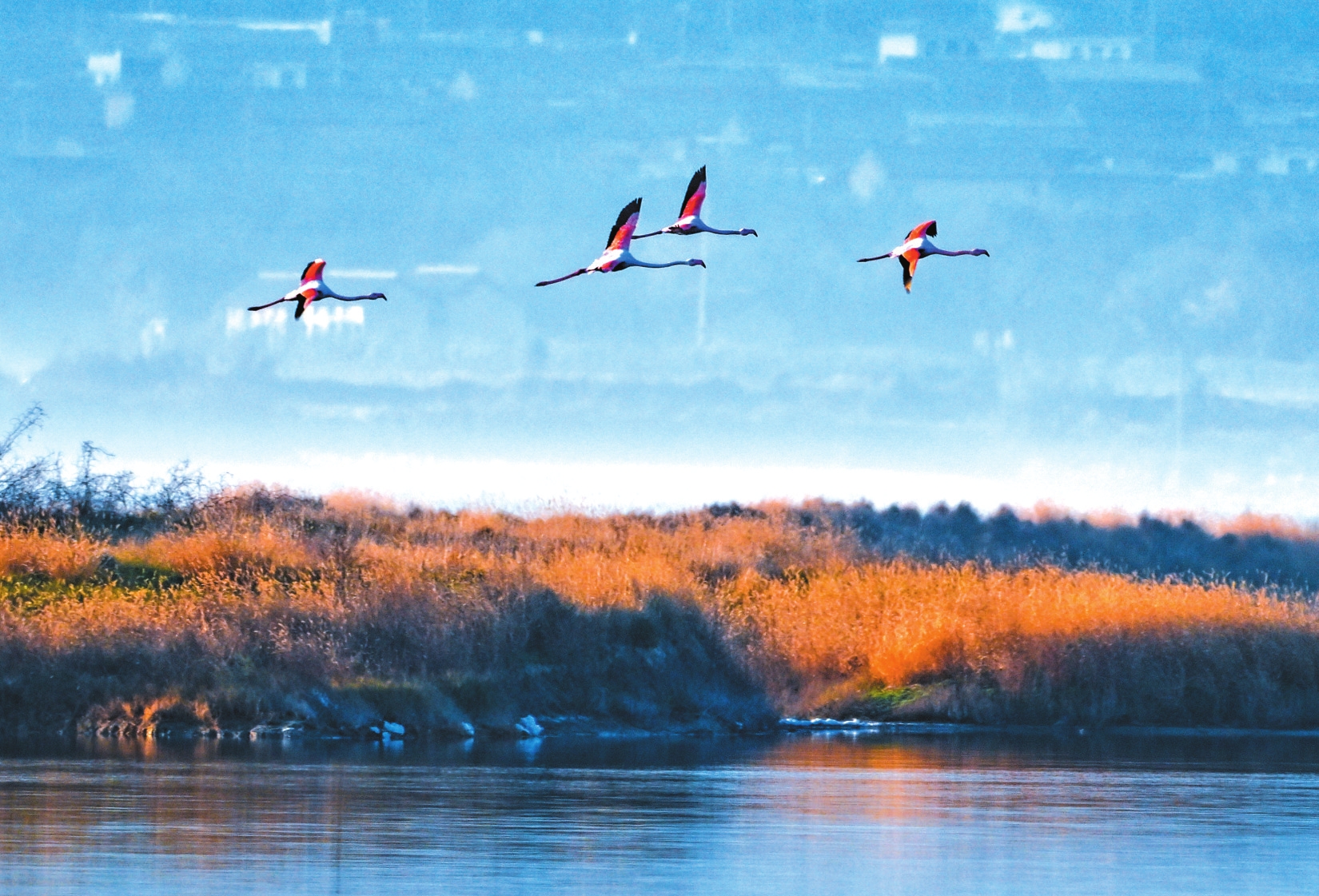 11月19日,火烈鸟在山西省运城盐湖湿地飞翔。