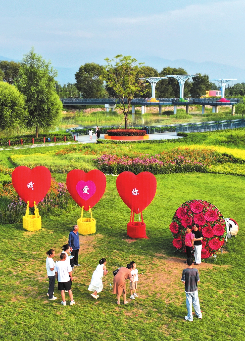 忻州牧马河生态公园游客打卡拍照。本报记者张存良摄