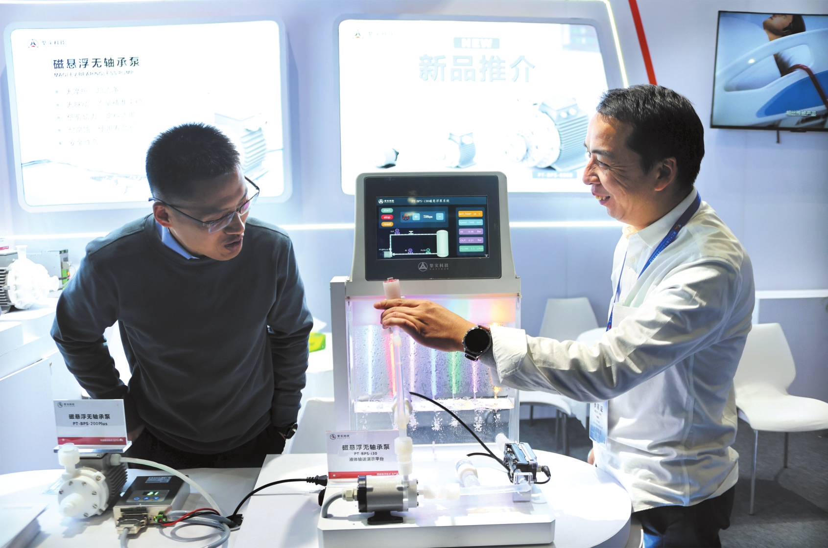 11月23日,工作人员在博览会现场演示磁悬浮无轴承泵的工作原理。