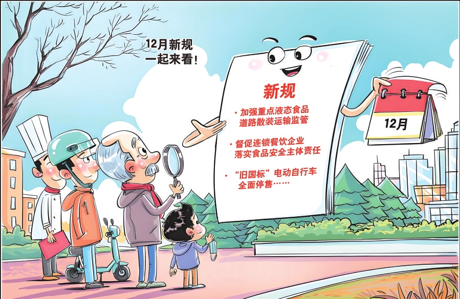 加强重点液态食品道路散装运输监管,守护“舌尖上的安全”;督促连锁餐饮企业落实食品安全主体责任,规范一些连锁餐饮企业“只开店、不管店”问题;“旧国标”电动自行车全面停售……12月新规,一起来看!