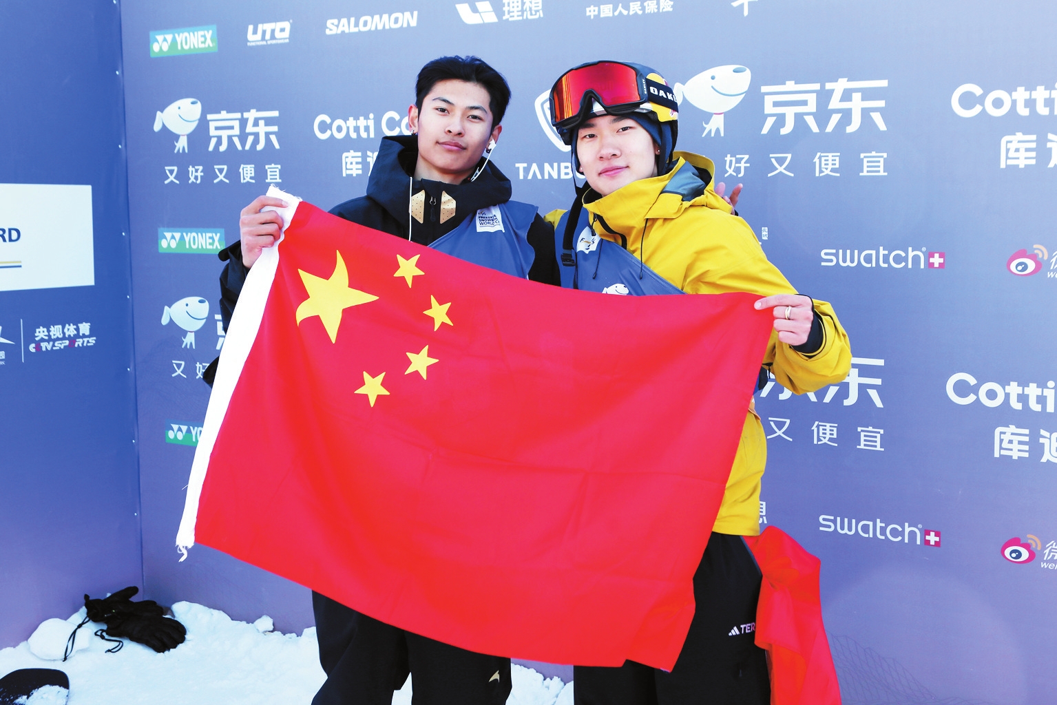 11月29日,冠军中国选手苏翊鸣(右)与亚军中国选手葛春宇合影。