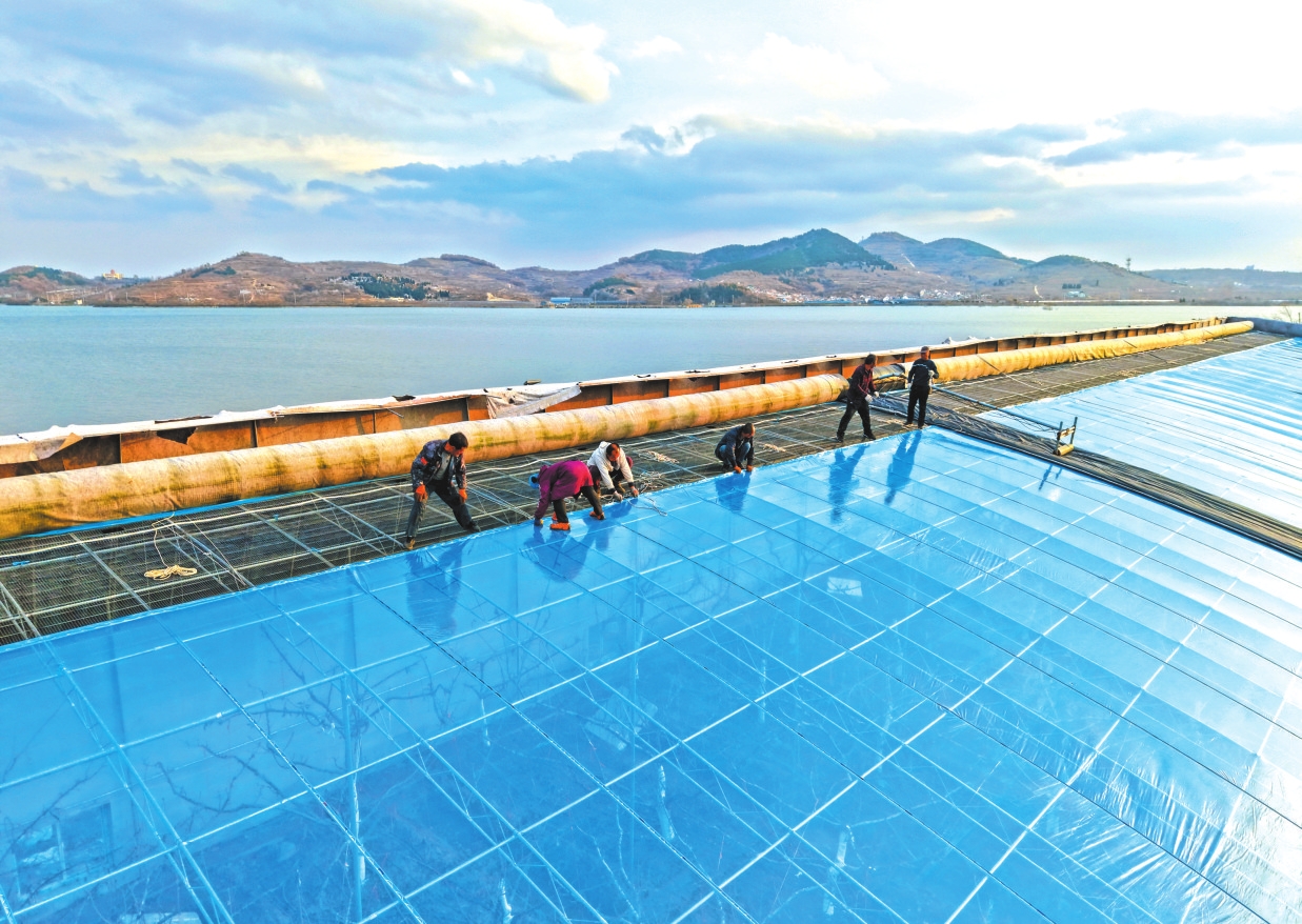 12月11日,在山东省烟台市福山区张格庄镇,农民为樱桃大棚更换新的塑料薄膜。