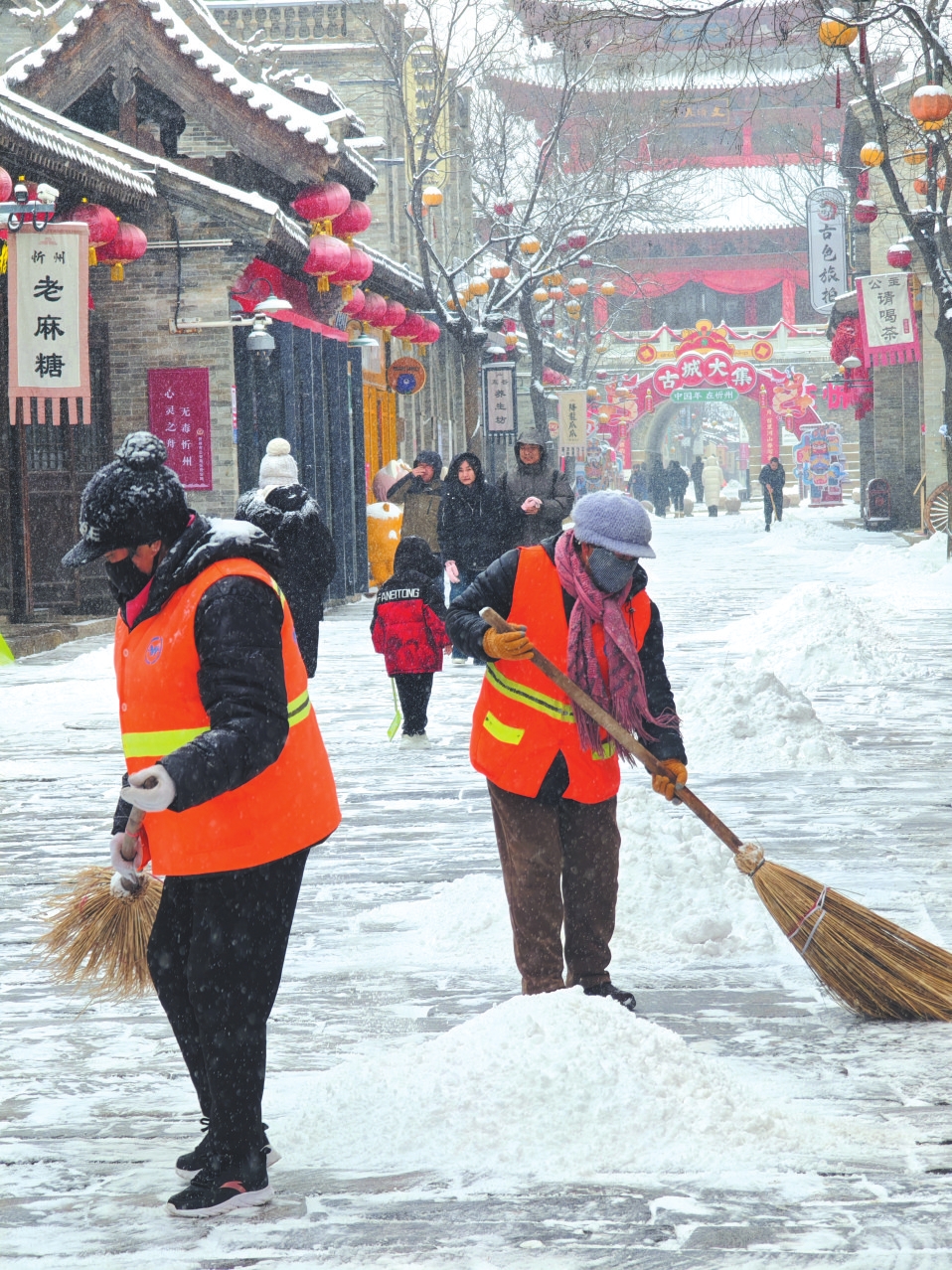 忻州古城环卫工人与沿街商户挥锹抡帚扫雪。 本报记者 魏鹏飞摄图