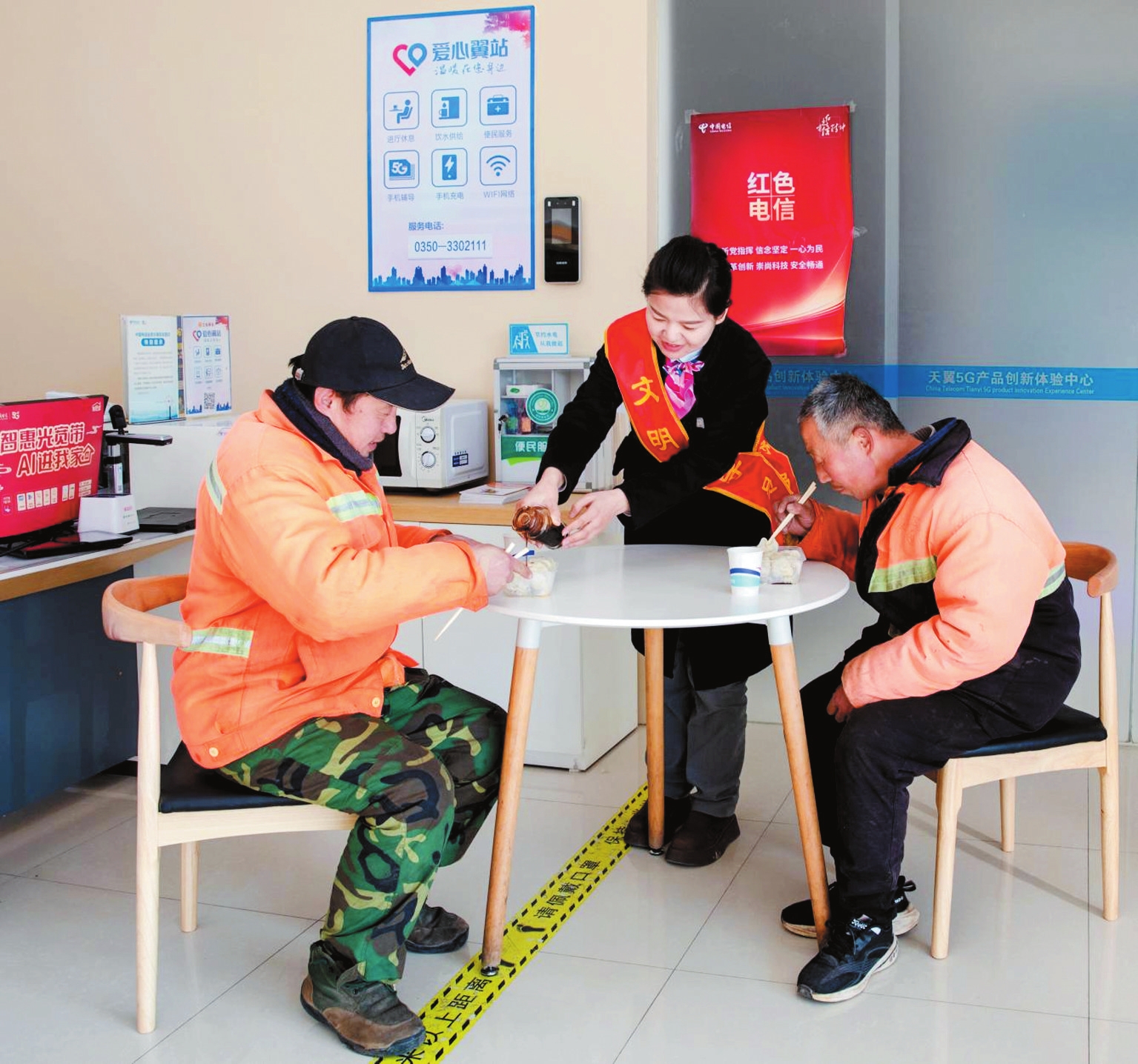 本报讯 12月21日,正值冬至时节,中国电信忻州分公司开展“情暖冬至翼路相伴”特别公益活动,为在寒风中默默坚守的环卫工人送去电信人的深情关怀与温暖守护,以实际行动彰显央企的社会责任与担当。