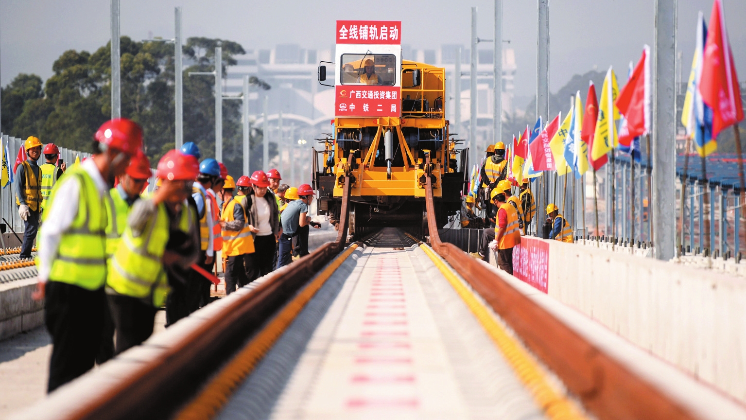 12月20日,南珠高铁玉林北至岑溪东段开始全线铺轨。南珠高铁玉林北至岑溪东段为南珠高铁南玉段的延伸,正线全长84.895公里,设计时速350公里,设玉林北、容县南、岑溪东3座车站,其中容县南、岑溪东为新建车站。 新华社记者 张爱林摄