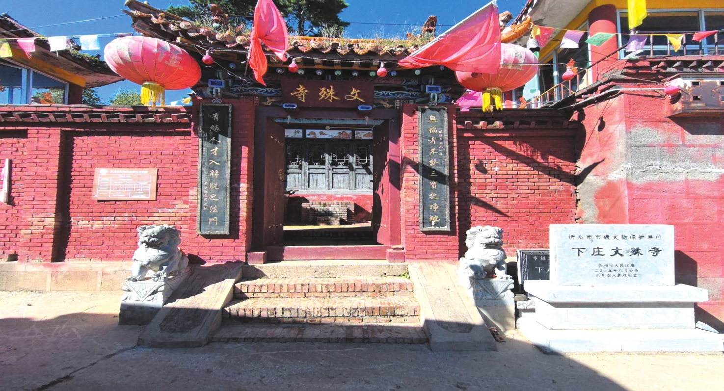 下庄文殊寺位于五台县东雷乡下庄村中,始创年代不详,现存建筑为明代所建。寺庙坐北向南,占地面积368平方米。山门一间,中置板门。正殿面宽三间、进深五椽,前出廊(此走廊属清代遗构,为后期加接),廊柱施斗拱,大斗口内出跳,两侧带有雕花翼拱。檐柱头斗拱为五踩,其下昂已被锯掉(现存昂嘴为清代更换的如意昂式);平身科斗拱亦为五踩。当心间设门,两次间设直棂窗。