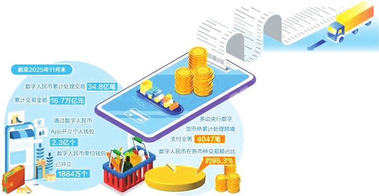 当前,境内和跨境数字人民币试验推广取得积极成效,在批发零售、餐饮文旅、教育医疗、公共服务、社会治理、乡村振兴、跨境结算等领域形成了覆盖线上线下、可复制可推广的应用模式。截至2025年11月末,数字人民币累计处理交易34.8亿笔,累计交易金额16.7万亿元。通过数字人民币App开立个人钱包2.3亿个,数字人民币单位钱包已开立1884万个。