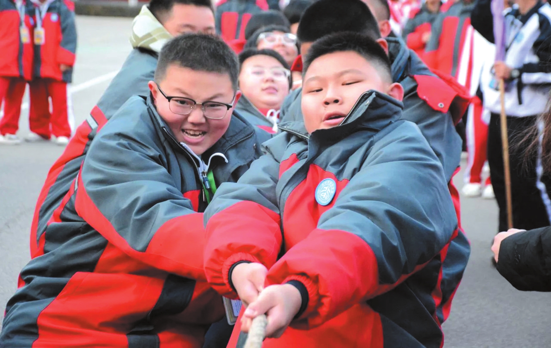 近日,忻州市北方初级中学举行了冬季拔河比赛。比赛哨声一响,赛场瞬间沸腾,参赛队员们紧握长绳,双脚蹬地,身体后倾;老师们化身为啦啦队长,挥动双臂,声嘶力竭地为队员们指挥节奏;各班同学则自发组成阵容强大后援团,将现场氛围一次次推向高潮。