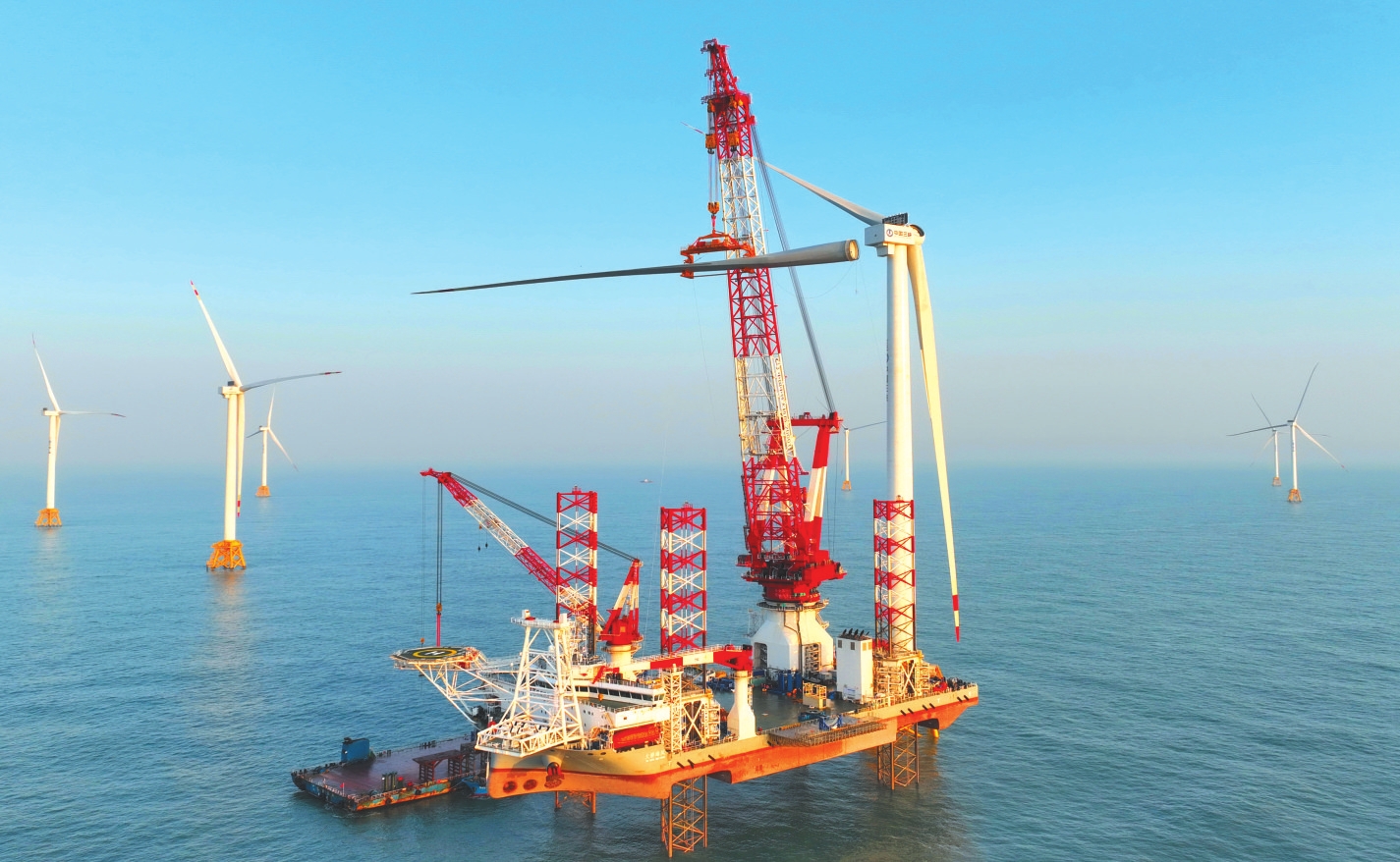 1月13日,在“大桥海风”号2000吨自升式海上风电安装平台上,20兆瓦风机叶片在进行吊装。1月13日,由三峡集团与金风科技联合设计建造和示范应用的20兆瓦海上风电机组在福建闽南海域完成吊装。该机组的成功吊装,是我国海上风电大容量机型应用的又一重要突破。新华社记者 林善传 摄