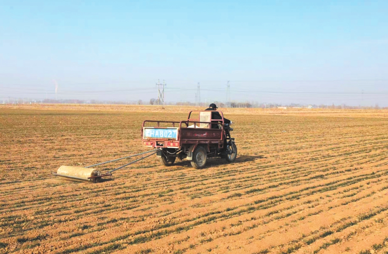 管护工人熟练地操作着磙子将麦田压实