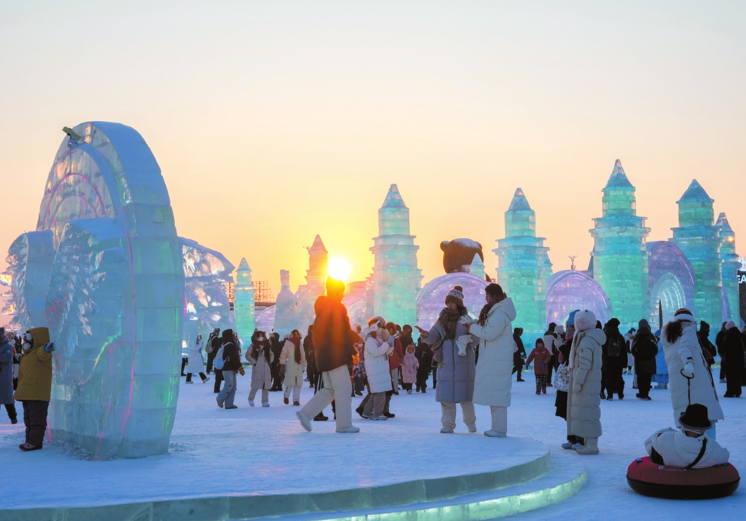 夕阳西下,落日余晖为哈尔滨冰雪大世界披上暖金霞光,游客尽享冬日的浪漫与温柔。 新华社记者 王建威 摄