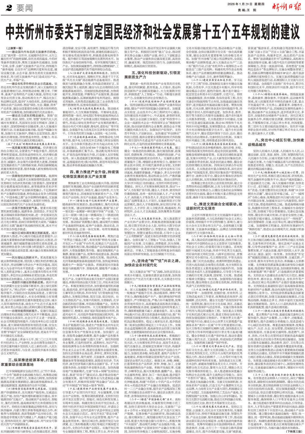 中共忻州市委关于制定国民经济和社会发展第十五个五年规划的建议